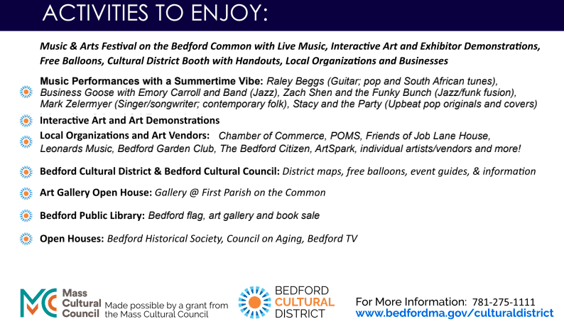 The Bedford Cultural District Partnership (BCDP) will be holding a Music & Arts Festival 2024 on Saturday, June 15th, on the Bedford Common (75 Great Road).
