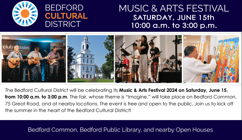 Bedford Town Common -75 Great Road 75 Great Road, Bedford, MA, United StatesThe Bedford Cultural District Partnership (BCDP) will be holding a Music & Arts Festival 2024 on Saturday, June 15th, on the Bedford Common (75 Great Road). Entertainment, education, and fun for all ages. Features diverse musical groups performing during the day, interactive art projects, open houses, local community booths, activities for kids and adults, and...